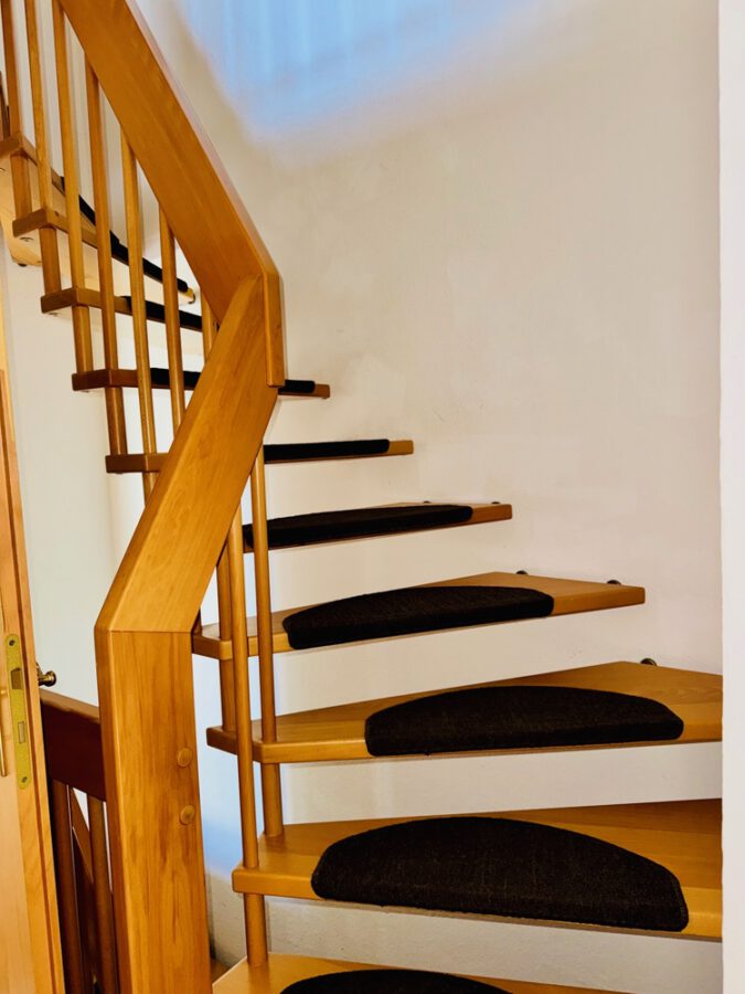 Beide Ebenen verbindet eine offene und geschwungene Holztreppe, dadurch entsteht
