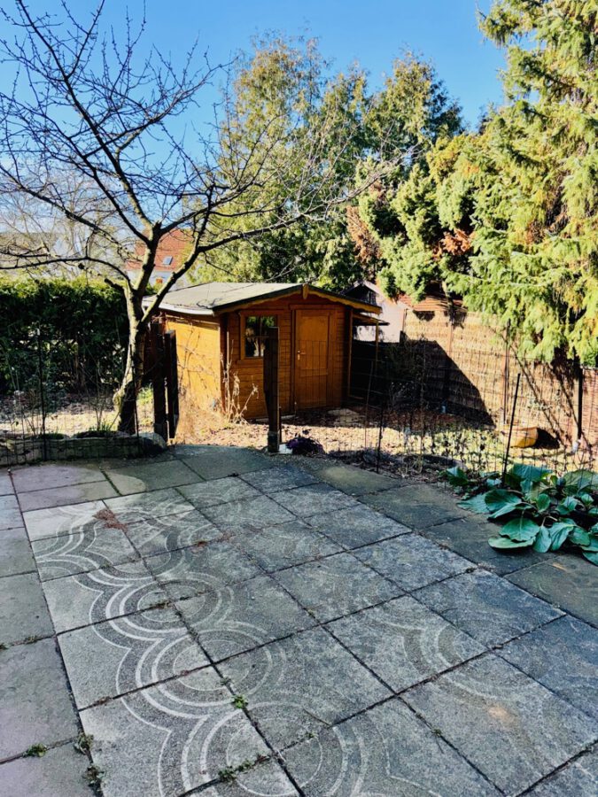 Ein Holzgartenhaus steht zur Nutzung zur Verfügung.