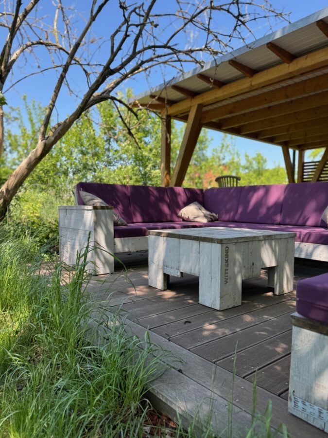 -Große Terrasse mit Tisch und Loungemöbeln.