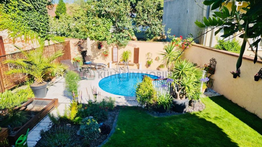Pool rundet das "Sommerfeeling" ab. Auf versetzter Ebene das große Schlafzimmer (22 m).