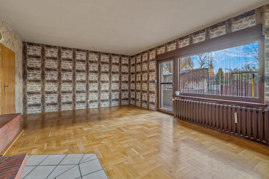 EG: Wohnzimmer mit gemauertem Kamin, Parkettfußboden und Ausgang zu Terrasse und Garten.